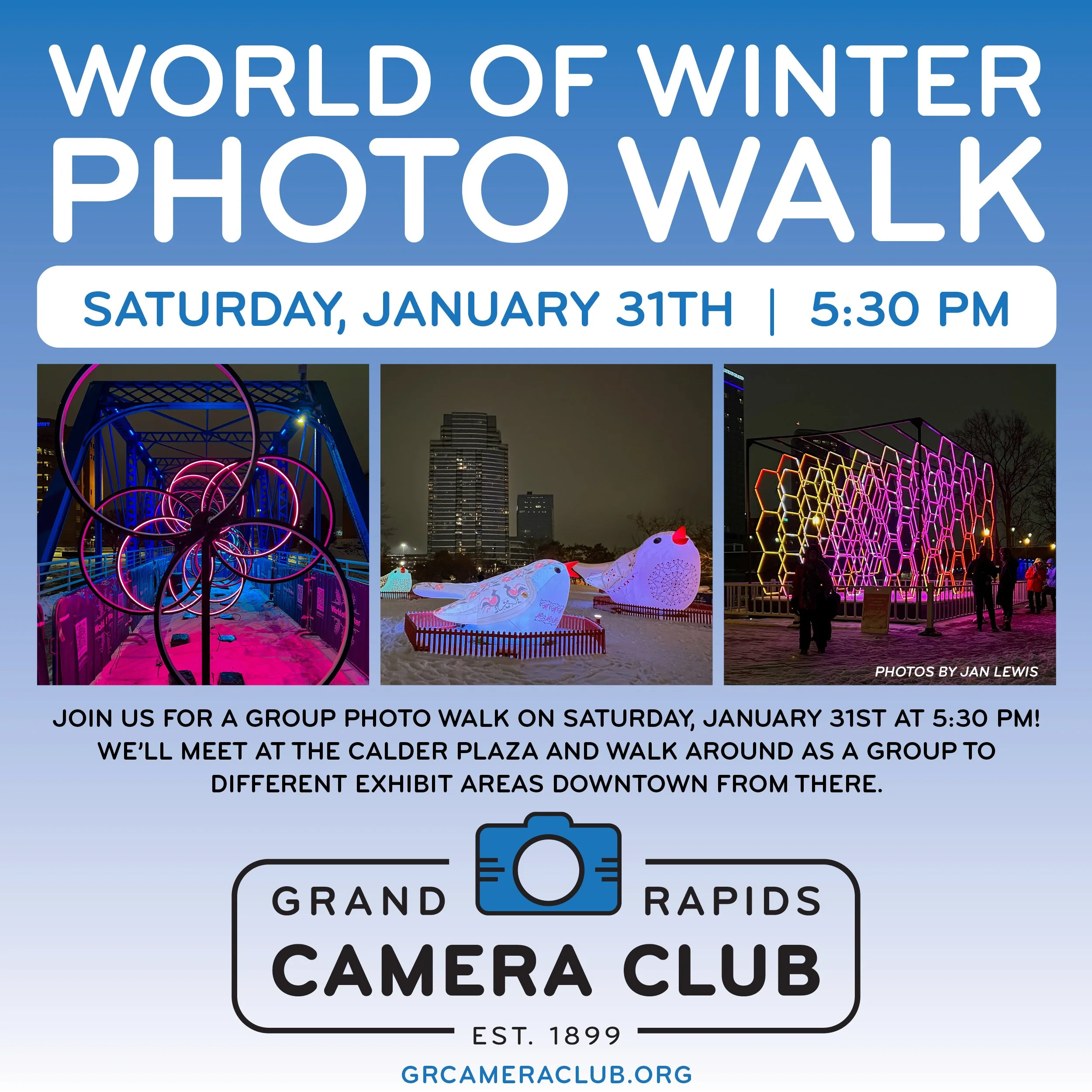 Meet Jan and Shea at the Calder Plaza Sculpture downtown Grand Rapids for a group photo walk! Experience the World of Winter art exhibits at night with other fellow GRCC photographers, giving the opportunity to learn from each other and be with a group that understands taking time to photograph and be able to use tripods! Dress warm!
